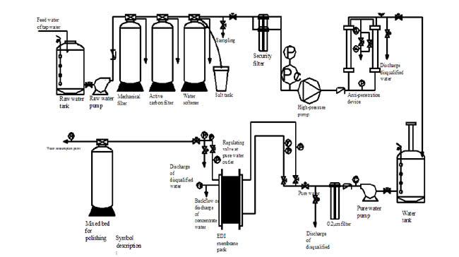 - Hệ thống EDI: Giai đoạn quan trọng nhất để đưa chất lượng nước đạt tiêu chuẩn là cụm module EDI. Sau quá trình điện phân nước, các ion trong nước sẽ được loại bỏ triệt để lên tới 99%, đưa chất lượng nước thành phẩm đạt điện trở suất trên 15 MΩ•cm.