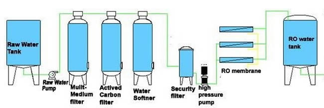 - Hệ thống RO: Thiết bị thẩm thấu ngược là thiết bị khử muối quan trọng trong quy trình này. Nhờ áp lực cao của bơm trục đứng, nước được đưa qua màng lọc RO với mặt lọc cực nhỏ 0.0001µm loại bỏ tới 99% chất rắn hòa tan (TDS). Sau quá trình lọc RO, nước có độ dẫn diện nhỏ hơn 25 µS/cm. Luôn phải có các vị trí có thể lẫy mẫu để kiểm tra định kỳ.