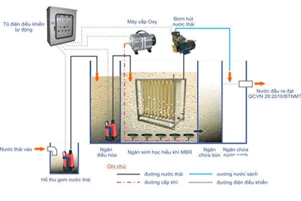 Nước thải ở bể thu gom được bơm nước thải bơm qua bể sinh học hiếu khí MBR. Bể sinh học này có nhiệm vụ khử BOD, COD…… Các vi khuẩn hiện diện trong nước thải tồn tại ở dạng lơ lửng do tác động của dòng chảy. Vi sinh hiếu khí phát triển sinh khối bằng cách lấy các chất ô nhiễm làm thức ăn.