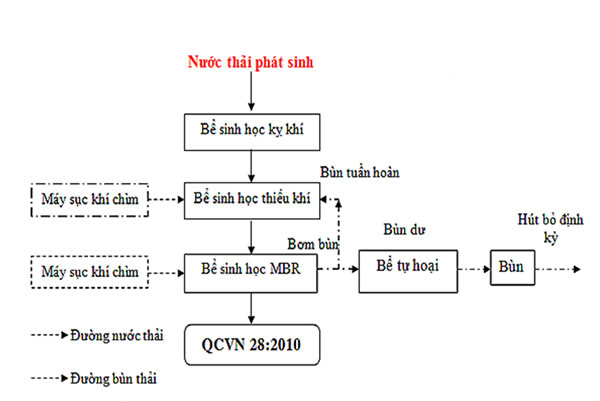 Lượng bùn dư từ bể sinh học hiếu khí MBR được dẫn về bể chứa bùn trước khi đem thải bỏ định kỳ theo đúng qui định của pháp luật. Phần nước sau khi tách bùn có chất lượng thấp sẽ được đưa tuần hoàn lại bể thu gom để tiếp tục xử lý.