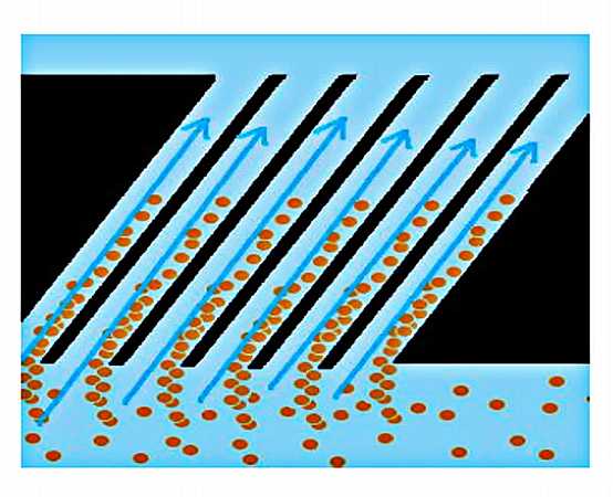 - Nguồn nước từ bể phản ứng vào bể lắng sẽ di chuyển theo chiều từ dưới lên theo các tấm lắng lamen (hoặc ống lắng) được thiết kế nghiêng 60°, trong quá trình di chuyển các cặn lắng (kết tủa hay bông lắng) sẽ va chạm vào nhau và bám vào bề mặt tấm lắng lamen. Khi các bông lắng kết dính với nhau trên bề mặt tấm lắng lamen đủ nặng và thắng được lực đẩy của dòng nước đang di chuyển lên thì bông kết tủa sẽ trượt xuống theo chiều ngược lại và rơi xuống đáy bể lắng (hay hố thu cặn), từ đó theo chu kỳ xả đi.