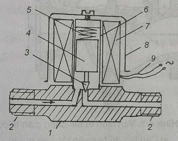 1. Thân van, 2. Đầu ren nối loe, 3. Kim van, 4. Lõi sắt mang kim van. 5. Lò xo, 6. Ống Inox, 7. Cuộn dây, 8. Vỏ bảo vệ cuộn dây, 9. Dây tiếp điểm