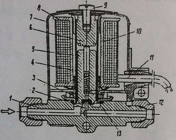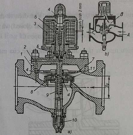 1. Thân, 2. Nắp van, 3. Cuộn dây điện từ, 4. Lõi cố định, 5. Lõi sắt động. 6, Clape van phụ 7. Màng cao su, 8. Clape van chính, 9. Lò xo, 10. Vít mở cưỡng bức bằng tay, 11. Tấm đệm lọc