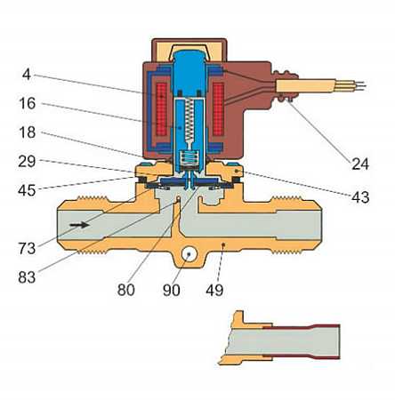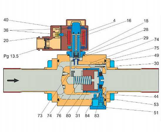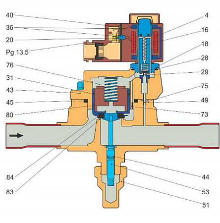 - 4. Cuộn dây điện từ, 16, lõi động, 18. tấm van, 20. đầu dây nối đất, 24. đầu nối mềm vào vỏ kim loại, 28. đệm kín, 29. cửa thoát van phụ, 30. đệm hình chữ O, 36. cọc tiếp điện theo DIN, 37. ổ cắm điện theo DIN 43650, 40. mũ bảo vệ, 43. nắp van, 44. đệm hình chữ O, 45. đệm kín nắp van. 49. thân van, 50. đệm kín, 51. ốc bịt kín, 53. trục vít mở van, 73. lỗ cân bằng, 74. kênh chảy chính, 75. kênh chảy phụ, 76. lò xo nén, 80. màng ngăn, 83. đế van, 84. tấm van, 90. lỗ bắt chặt khi lắp đặt van.