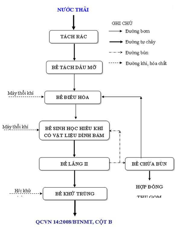 Các quá trình xử lý từ bể điều hòa sẽ lắng các chất bùn vi sinh. Các bùn lắng này sẽ bám vào các ống dẫn, sau khi đi qua ống dẫn thì sẽ lắng xuống đáy. Nước trong ống khi ra ngoài sẽ chảy với mức rât chậm để không cho bùn thoát ra. xu ly nuoc thai nha hang khach san Nồng độ nước thải có nồng độ COD,BOD khoảng 70-80%. Bùn trong bể sẽ được bơm vào bể sinh học hiếu khí dính bám và tiêu hủy theo quy định. Sau đó đến quy trình khử trùng tại bể khử trùng.